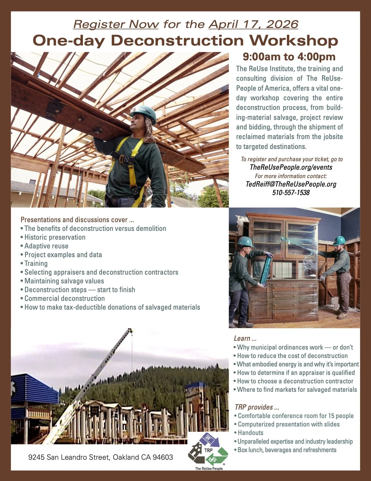 The ReUse Institute, the training and consulting division of The ReUse People of America, offers a vital one-day workshop covering the entire deconstruction process, from building-material salvage, project review and bidding, through the shipment of reclaimed materials from the jobsite to targeted destinations.