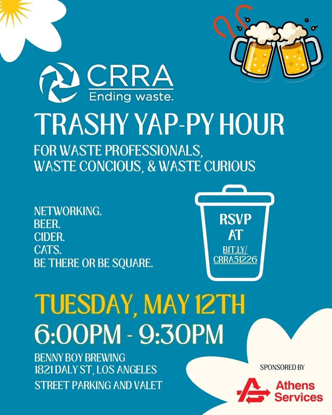 California Resource Recovery Association (CRRA) is hosting their first Trashy Yap-py Hour! Come yap, talk trash, and sip on a cold drink with industry peers and waste-curious peeps of all ages and experiences. Special thanks to Athens Services for sponsoring the venue.